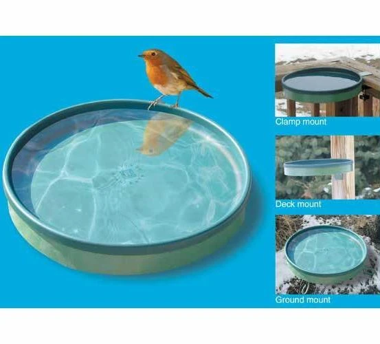 Durable heated birdbath provides a consistent fresh water source to attract more wild birds. Heated birdbath features easy clamp on–means no damage to deck rails. Ground stand is durable powder-coat metal, with sturdy post-mounting hardware too.